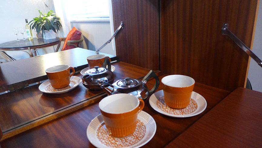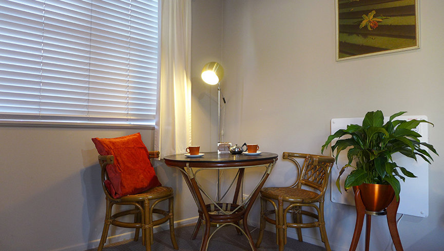 The room includes tea and coffee making facilities, plates, cutlery, toaster, microwave, fridge and a small round cane breakfast table & chairs.